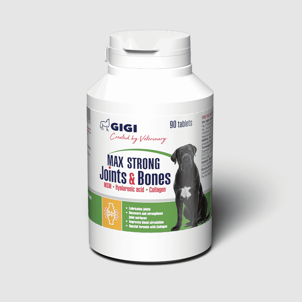 GIGI Max Strong Joints & Bones е високоефективна хранителна добавка за кучета, създадена за интензивна подкрепа на ставите и костите. Формулата е насочена към поддържане функцията на тазобедрените стави, гъвкавостта и активния начин на живот на вашето куче.