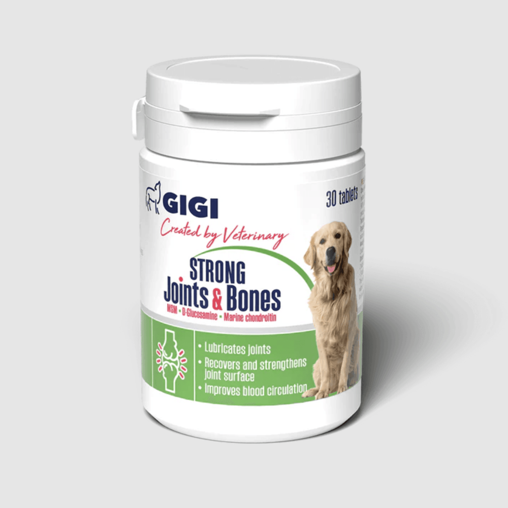 GIGI Strong Joints & Bones е хранителна добавка за малки и средни породи кучета до 30 кг, създадена за подпомагане здравето на ставите и костите.